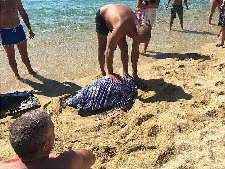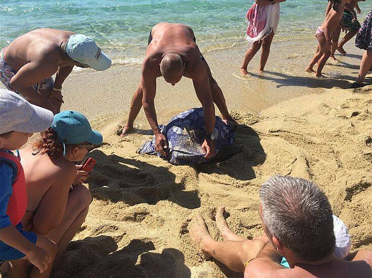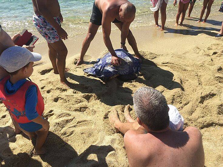 Οι λουόμενοι κάλεσαν το Λιμενικό για να παραλάβει το τραυματισμένο ερπετό ενώ κάποιοι πρόσφεραν βοήθεια με νερό και δροσερές πετσέτες όπως βλέπετε και στις παρακάτω φωτογραφίες.