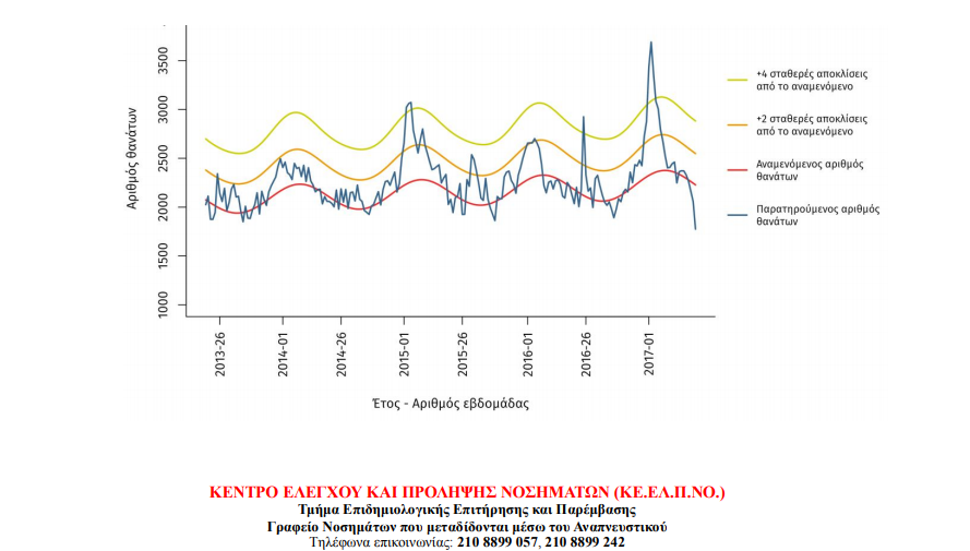 αναμενόμενο, φτάνοντας την εβδομάδα 2/2017 να υπερβαίνει το αναμενόμενο κατά 6.4SD ή 3.686 θανάτους. Στη συνέχεια η θνησιμότητα ακολούθησε πτωτική πορεία, πέφτοντας την εβδομάδα 7/2017 κάτω από το όριο των 2 τυπικών αποκλίσεων από το αναμενόμενο. Οι θάνατοι αυτοί