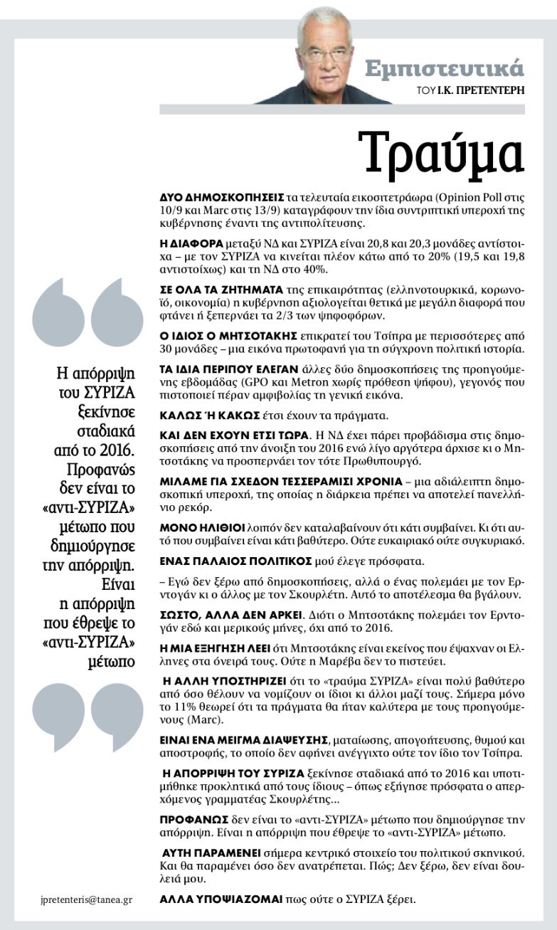 Βαρόμετρο είναι ο αινειαν, όπου πάει αυτός, εκεί θα είναι ο νέος πόλοςScouser έγραψε: 16 Σεπ 2020, 16:11Δεν υπάρχει περίπτωση. Προφανώς και αργά ή γρήγορα θα δημιουργηθεί δεύτερος, εναλλακτικός της ΝΔ πόλος, αλλά αυτός αποκλείεται να είναι ο ΣΥΡΙΖΑ (τουλάχιστον στη σημερινή του μορφή). Είναι αρκετά πιθανό να ανακάμψει στο μέλλον το ΠΑΣΟΚ, όταν η Φωφάρα αντικατασταθεί από κάποιον της νέας γενιάς από αυτούς που ''γράφουν'' ωραία στο γυαλί, και να απορροφήσει εκ νέου τους καιροσκόπους που μετακόμισαν στον ΣΥΡΙΖΑ στη μετα 2012 εποχή.Ντρές έγραψε: 16 Σεπ 2020, 15:35 Καθολου τελειωμένος δεν είναι ο Συρίζα, αυτοι είναι απλά ευσεβείς πόθοι καποιων που ακουν Συρίζα και βγάζουν σπυράκια.