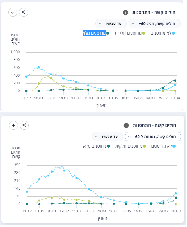 - Στους κατω των 60 ετων, οι κριτικαλ οι εμβολιασμενοι αποτελουν το 35% (54/158), που είναι λογικό γιατί στους κάτω των 60 το ποσοστό εμβολιασμού είναι αρκετα κάτω του 50% (ώστε σε όλο το Ισραηλ να βγαινει ο μεσος ορος στο 60-65% ποσοστο εμβολιασμου)