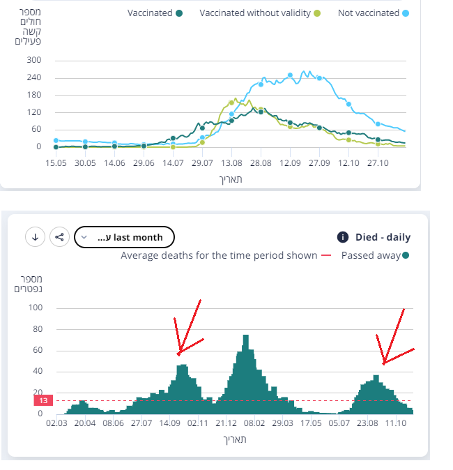 Σε ολο τον Ιουλιο οι εμβολιασμενοι στις ΜΕΘ ηταν περισσοτεροι απο τους ανεμβολιαστους. Οι Εβραιοι το ειδαν και από 1η Ιουλιου ξεκινησε να χορηγειται 3η δοση, και τον Αυγ η καμπυλη των ανεμβολιαστων τους προσπερασε και πηγε αρκετα πιο πανω. Τωρα αμφοτεροι ειναι σε υφεση και η αναλογια ειναι κατι σε 132 - 17 = 88% - 12% = ανεμβολιαστοι - εμβολιασμενοι.