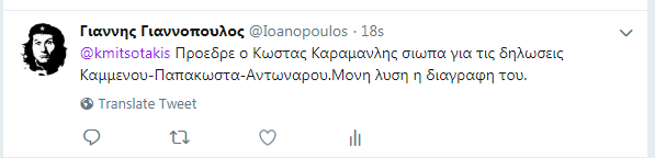 Πολύ έξυπνη κίνηση!ΓΙΑΝΝΗΣ ΓΙΑΝΝΟΠΟΥΛΟΣ έγραψε: 12 Σεπ 2018, 12:23 Μετα το κρεσεντο Καμμενου-Παπακωστα-Αντωναρου οι οποιοι χρησιμοποιουν συνεχως το ονομα του Καραμανλη για να πληξουν την ΝΔ ,και με δεδομενο οτι ο Κωστακης δεν εχει βγαλει ουτε κιχ για ολα αυτα θεωρω πως ειναι μονοδρομος η διαγραφη του απο την ΝΔ