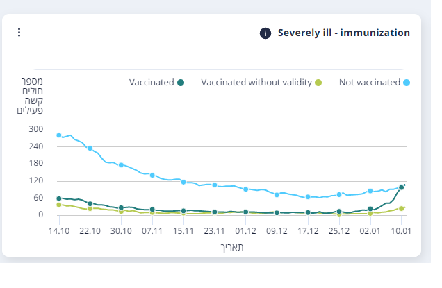Ετσι στο διαγραμμα που δειχνω ειναι ορατο πως, απο μια περιοδο που το συστημα υγειας στο Ισραηλ δεχοταν 8 βαρια ασθενεις εμβολιασμενους και 75 ανεμβολιαστους, 1 μηνα μετα