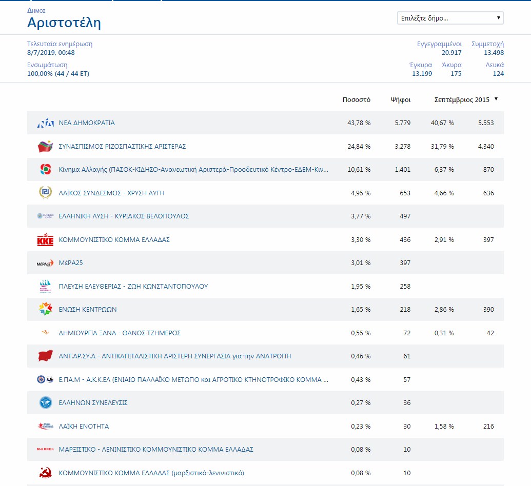 Δημος Αριστοτελη:ΝΔ 43.78%-ΣΥΡΙΖΑ 24.84%