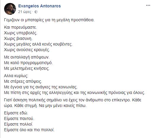 Μετά την αντίδραση του Ευάγγελου Αντώναρου ο οποίος τον χαρακτηρίζει «ξένο σώμα που παίζει το δικό του βιολί και υποσκάπτει την προοπτική νίκης της Νέας Δημοκρατίας»,