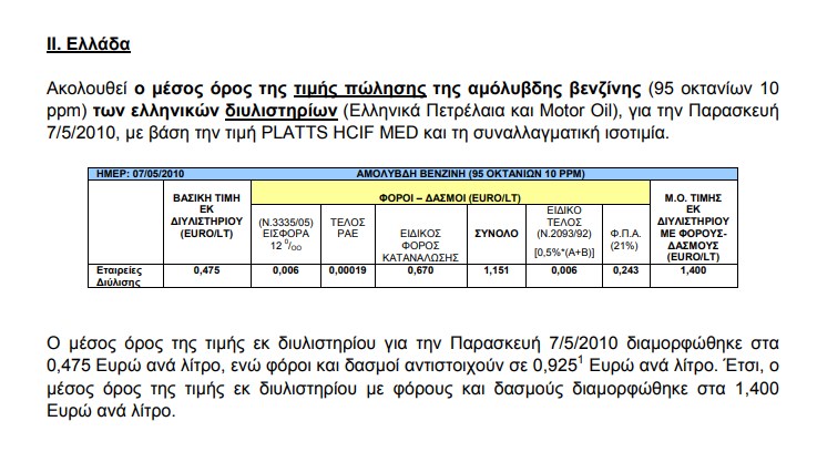 Βασικά περίπου τα ⅔ της τιμής της βενζίνης οφείλονται στη φορολογία. Με τις τωρινές τιμές του πετρελαίου στην αγορά (προ της επεξεργασίας) και του κόστους διύλισης, υπολογίζω πως η βενζίνη θα κόστιζε περίπου 55--60 λεπτά το λίτρο χωρίς φορολογία.